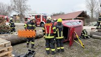 Ein Fahrzeug lag auf der Seite, eine Person war eingeschlossen. Nach der Stabilisierung des Fahrzeugs wurde der Patient erstversorgt und ĂŒber die Heckklappe gerettet.